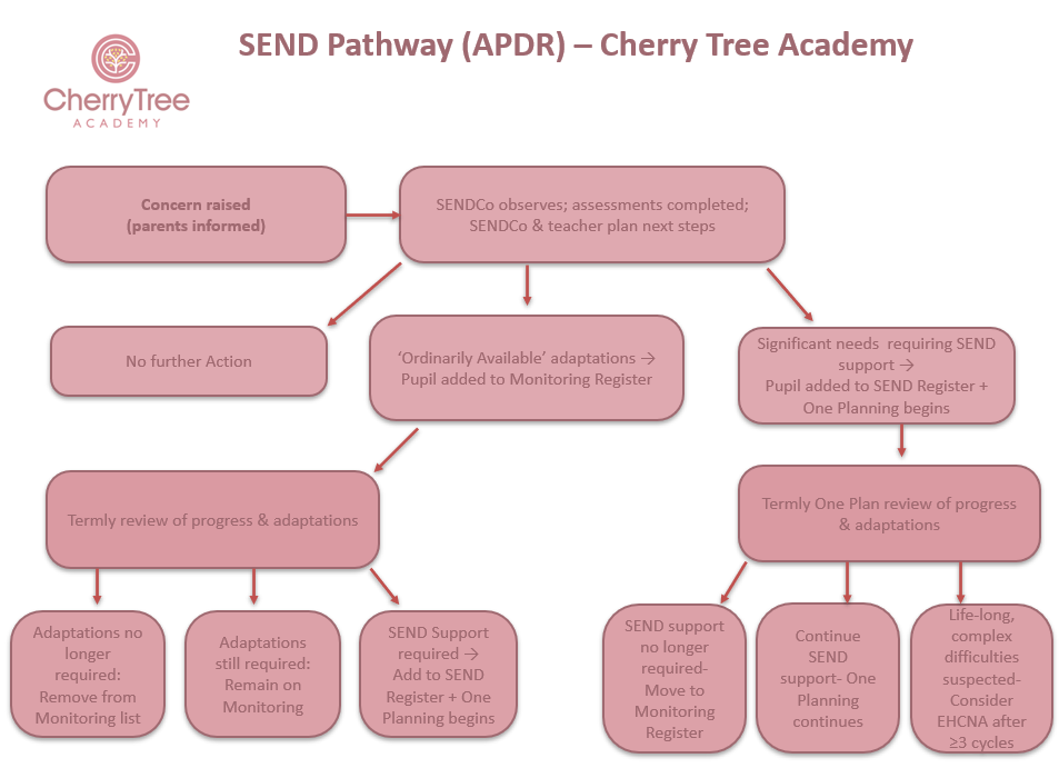 At Cherry Tree Academy, we are committed to creating an inclusive, welcoming environment where every pupil feels valued, respected and supported to achieve their very best. We work closely with pupils, families and staff to identify needs early, remove barriers to learning and ensure every child can thrive both academically and emotionally. Our approach reflects the principles of the SEND Code of Practice and sits at the heart of our school ethos.